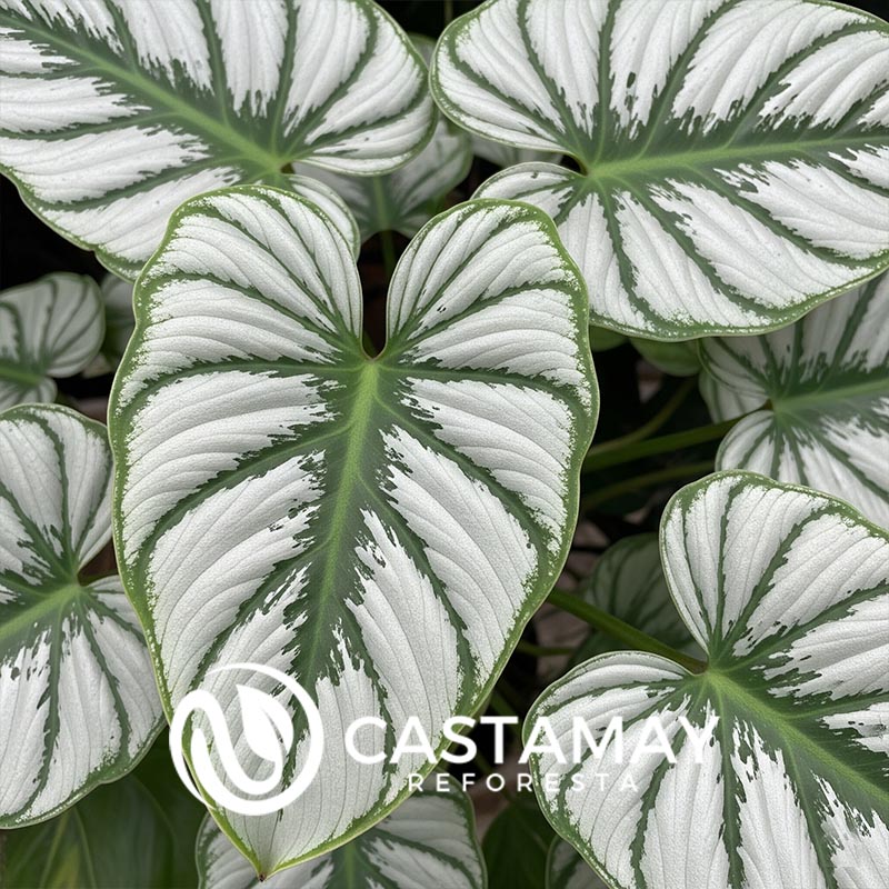 Perteneciente a la familia Araceae, el 'Silver Cloud' es altamente cotizado por los coleccionistas. Su principal atractivo son sus grandes hojas en forma de corazón, que parecen haber sido salpicadas generosamente con una pintura plateada y metálica. Una característica distintiva de la especie son sus peciolos (tallos de las hojas), que son aplanados y tienen bordes ondulados, añadiendo otro punto de interés a su ya espectacular apariencia.