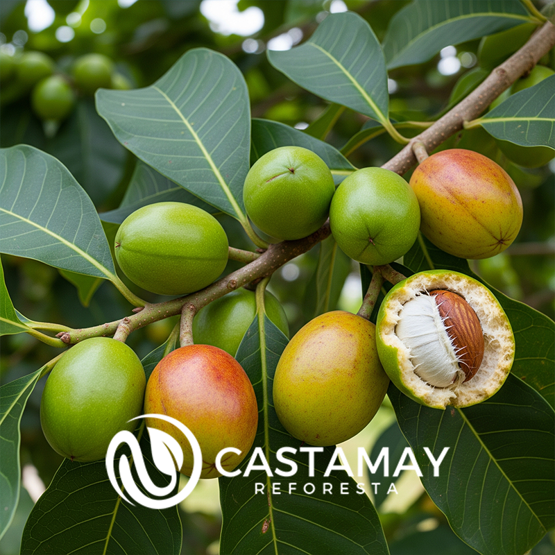 Frutos:Son drupas duras, de forma ovalada y aplanada, que miden hasta 7 cm de largo. Presentan dos crestas laterales y no tienen alas prominentes (a diferencia de otros Terminalia). Inicialmente son verdes, luego se tornan amarillos y finalmente rojos al madurar. La pulpa es fibrosa y encierra una cáscara dura que contiene una única semilla.