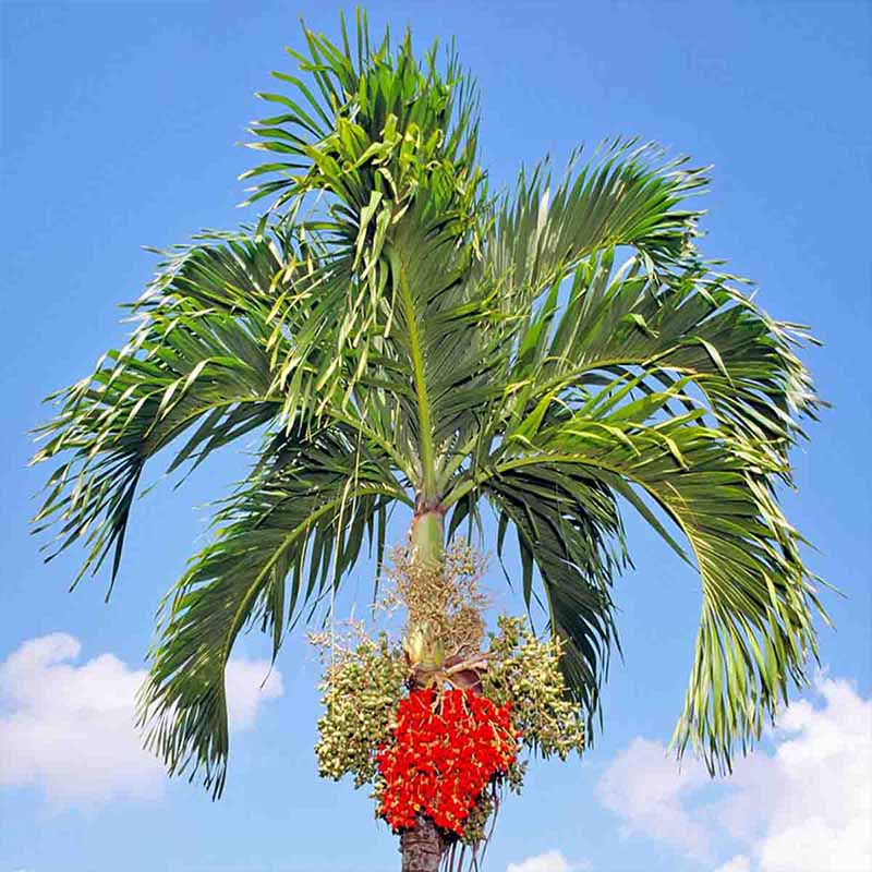 • Ornamental: Su principal uso es como planta ornamental en jardines tropicales y subtropicales, parques, avenidas y como planta de interior en climas fríos. Su porte elegante, su capitel bien definido y, sobre todo, el contraste de sus hojas verdes con los racimos de frutos rojos brillantes, la hacen muy atractiva. A menudo se plantan en grupos de tres para dar un aspecto más denso y frondoso.