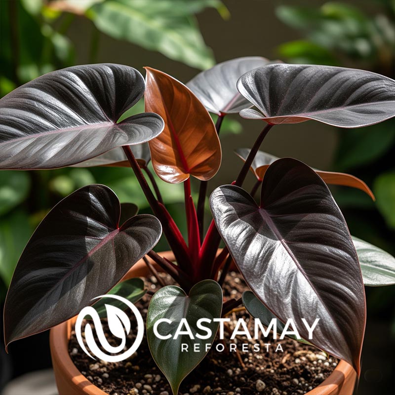 Perteneciente a la familia Araceae, este cultivar fue desarrollado en Florida, EE. UU., y se ha consolidado como un clásico del diseño de interiores. Su principal atractivo son sus hojas nuevas, que emergen en tonos de un profundo borgoña a un color casi negro, creando un punto focal impactante antes de madurar a un verde oscuro.