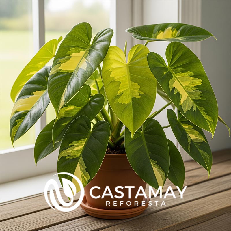 Contraste de Color Vibrante: La combinación de las hojas amarillo-verdosas con los peciolos de color rosa intenso es uno de los contrastes más hermosos y llamativos que se pueden encontrar en un filodendro.