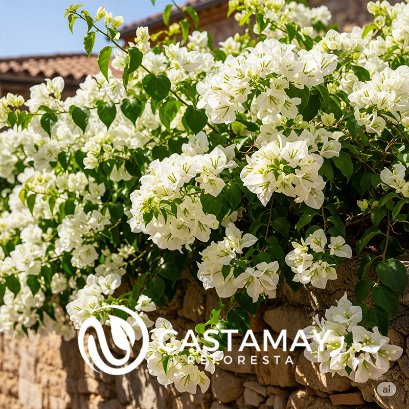 La bugambilia blanca es una variante particularmente elegante y versátil de este popular arbusto trepador. Aunque la flor verdadera es pequeña y discreta, las "flores" blancas que admiramos son en realidad brácteas, hojas modificadas que rodean las flores.
